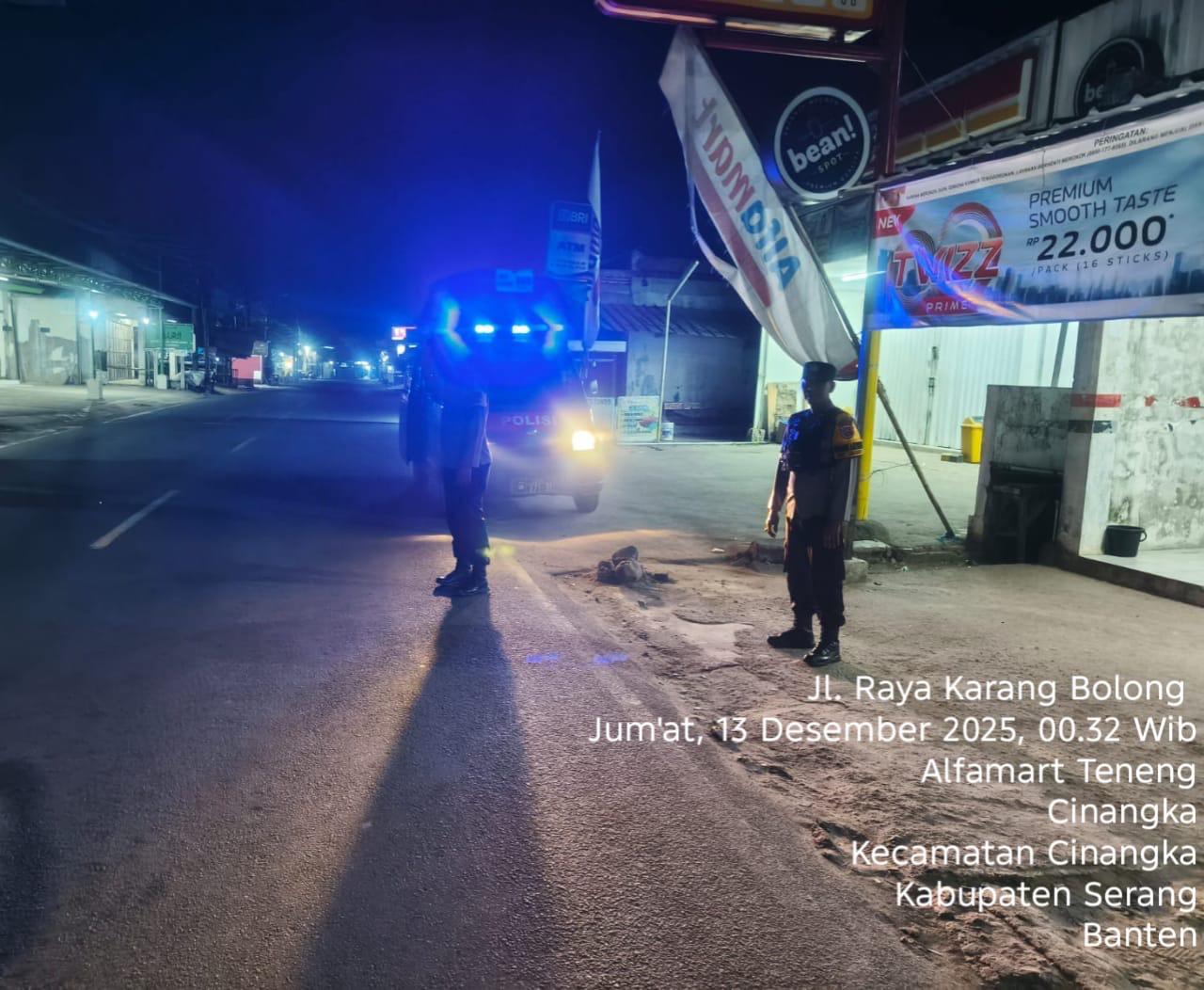 *Polres Cilegon* – Dalam Rangka Pencegahan Kejahatan Jalanan dan Memelihara situasi keamanan dan menjaga serta memberikan rasa aman dan nyaman di masyarakat,Salah satu upaya untuk mewujudkan hal tersebut sebagaimana yang dilakukan oleh Personil Polsek Cinangka Polres Cilegon Polda Banten melaksanakan giat patroli blue light malam hari hingga menjelang pagi, Sabtu (13/12/2025).