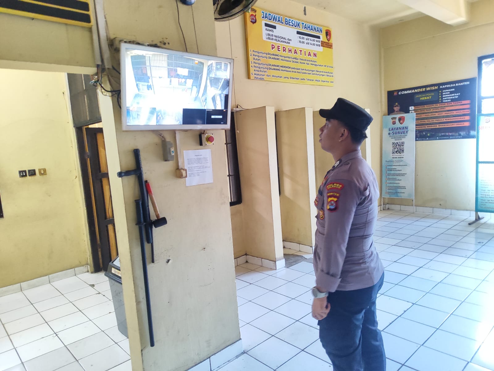 Personil Sat Tahti Cek Tahanan melalui CCTV yang ada di Rutan Polres Cilegon.