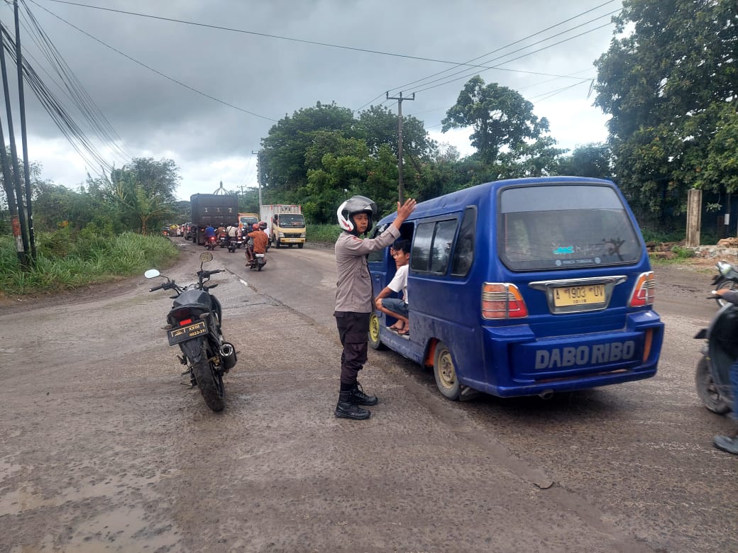 Strong Poin Sore, Bripka Bambang Personil Polsek Bojonegara Laksanakan Gatur lalu lintas Di Jalan Raya PT Bam Bojonegara