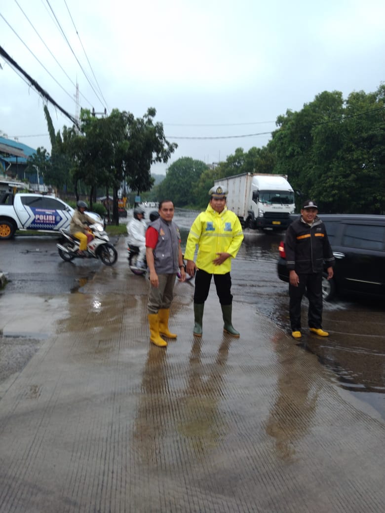 Cilegon - Personil Polsek Ciwandan melaksanakan monitoring genangan air dampak cuaca hujan lebat di wilayah hukum Polsek Ciwandan, Rabu (14/01/2026).