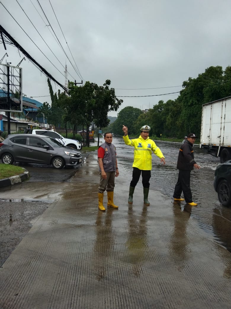 Lokasi yang tergenang air yaitu Jl. Raya Ciwandan Anyer (Depan Koramil Ciwandan), Kel. Tegal Ratu Ciwandan, dengan ketinggian 30-40 Cm.
