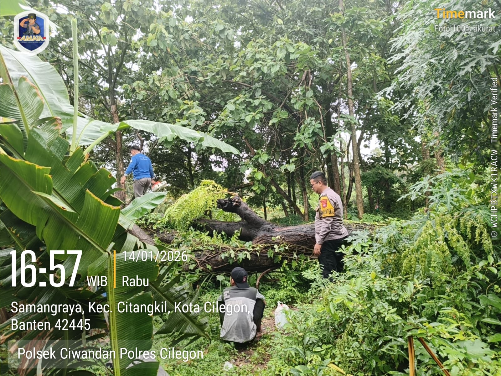 Cilegon - Bhabinkamtibmas Kelurahan Samangraya BRIPKA Marisco bersama Tagana Kota Cilegon dan perangkat RW dan RT, membantu membersihkan area rumah Sdri. IIN yang tertimpa pohon tumbang di Link. Kubang Welut Rt 06/04 Kel. Samangraya. Kamis (15/01/2026).