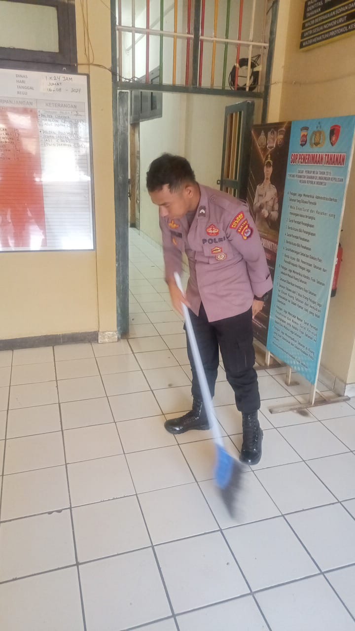 Anggota Piket Sattahti Polres Cilegon Selalu Melakukan Merutinkan Bersih-Bersih Di Sekitar Rutan Polres Cilegon Agar Terhindar Dari Penyakit.