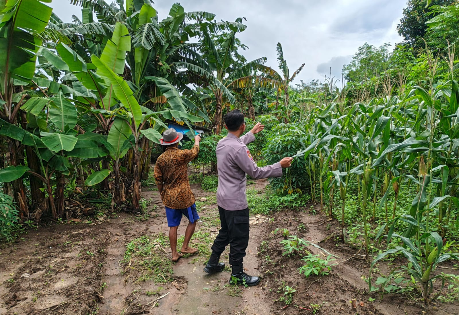 Dalam kegiatan monitoring ini, Bhabinkamtibmas meninjau langsung kondisi lahan jagung.