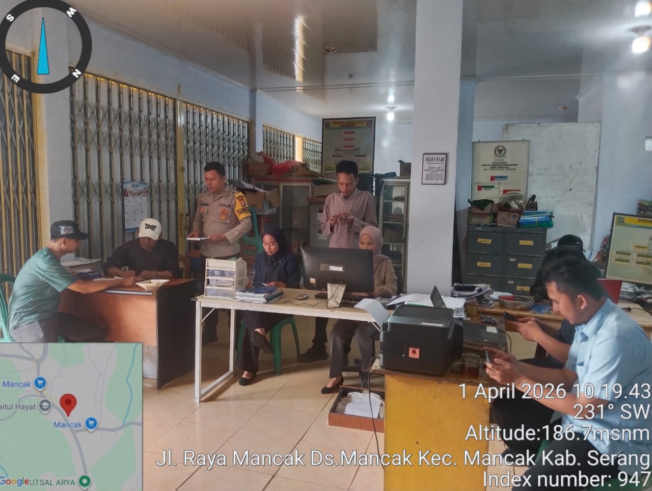 Cilegon – Polres Cilegon Polda Banten, dalam rangka ciptakan situasi kamtibmas kondusif Bhabikamtibmas Desa Mancak Kec. Mancak AIPDA Darsiwan laksanakan himbauan kamtibmas dengan Staf Desa Mancak dan Masyarakat, agar selalu menjaga kamtibmas secara bersama-sama di wilayah. Rabu (01/04/2026).