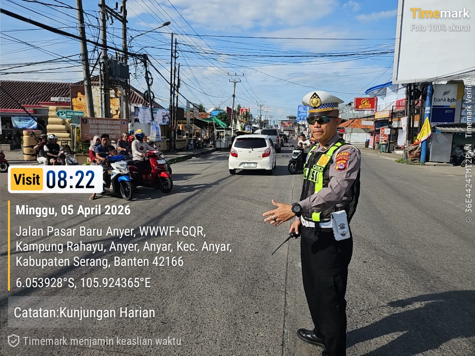Cilegon - Polres Cilegon Polda Banten, Demi kelancaran arus lalu lintas jalur wisata yang berada di daerah hukum Polres Cilegon, Personil Polres Cilegon lakukan pengamanan dan pengaturan arus lalu lintas wisata Anyer - Cinangka, Minggu (05/04/2026).